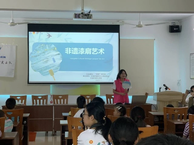 此次活动由岭南师范学院社会实践队--“育梦”突击队携手新兴街道团工委共同发起。活动现场,孩子们在队员们的带领下,亲手体验了从选材、打磨、上色到装饰的漆扇制作全过程。课程中,队员详细讲解了漆扇的历史、文化内涵以及制作技巧,孩子们听得津津有味,表现得热情高涨、跃跃欲试。