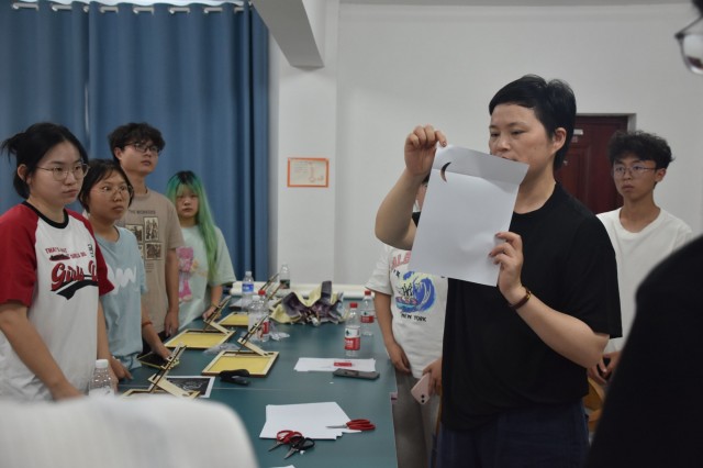 中午休息之后,酷热依旧笼罩着大地。骄阳似火,空气仿佛都被灼烧得滚烫。当我们再次踏入剪纸工作坊,曹小琴老师已经等候在那里。老师的脸上洋溢着亲切的笑容,仿佛这炎热的天气丝毫没有影响到她的心情。