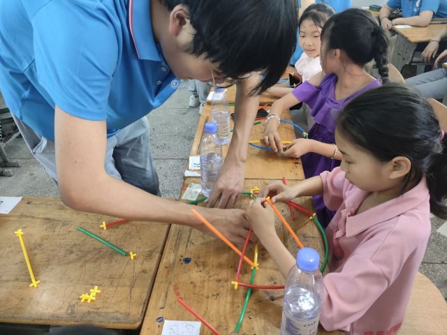 图为三下乡志愿者教授孩子们用吸管拼接世界