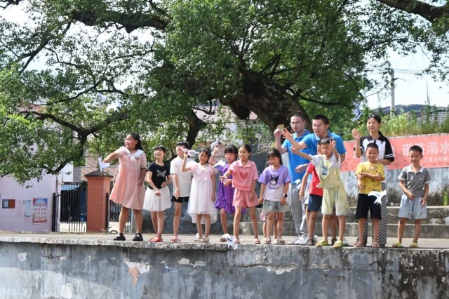 图为三下乡志愿者与孩子们一起放飞纸燕子