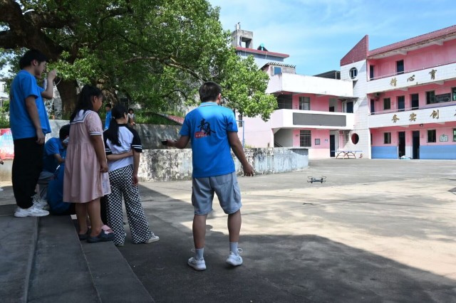 图为三下乡志愿者向孩子们展示无人机飞行