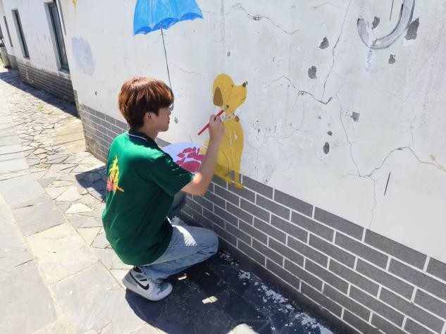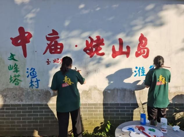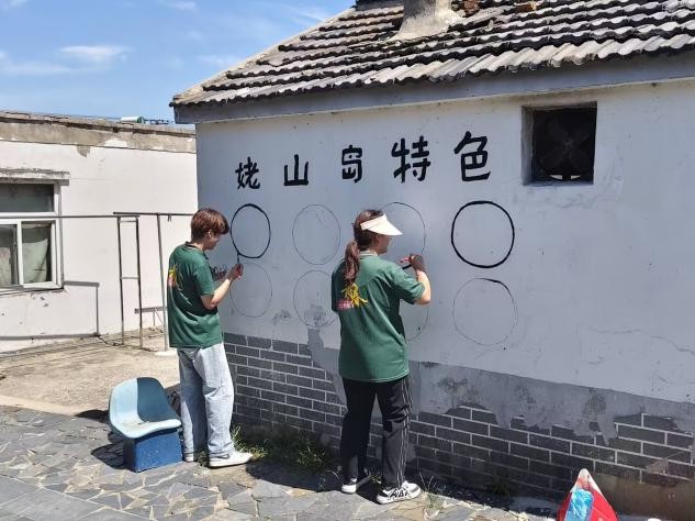 图为实践团成员对姥山岛墙体彩绘修复。通讯员 周灿宇 供图