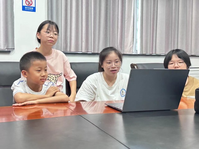 图为志愿者与小朋友认真观看视频资料。通讯员 刘玳宁 摄