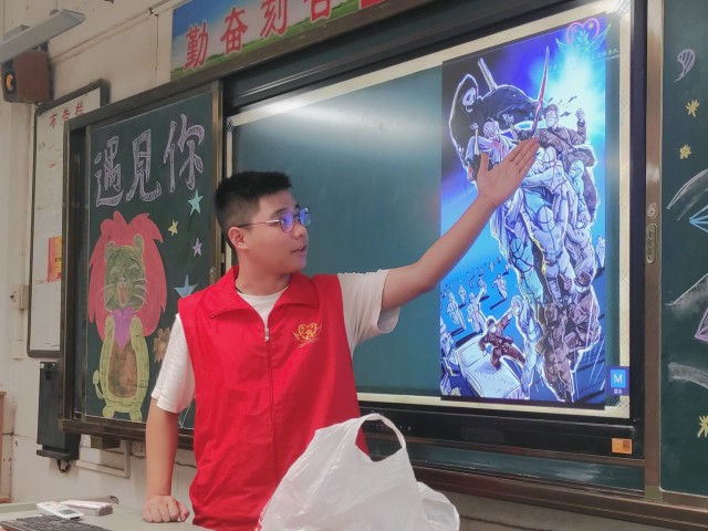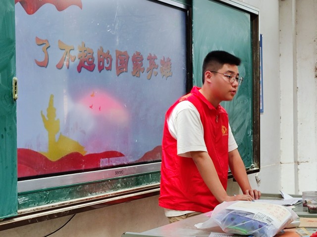 2024年7月15日,阳光明媚,微风轻拂。广东医科大学榕菁志愿服务队队员们为孩子们带来了一堂别开生面的弘扬英雄精神课程。课程伊始,教学部队员通过生动的故事和精彩的图片,告诉孩子们国家英雄是因为他们的勇气、智慧或贡献而备受尊敬和赞扬的人物,向孩子们介绍了不同历史时期的英雄人物,从近代的赵一曼、邱少云到现代的袁隆平等。孩子们聚精会神地聆听着,眼中闪烁着敬佩和向往的光芒。