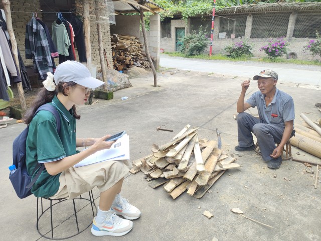 当志愿者们用普通话和爷爷交流时,发现爷爷只能听懂普通话并不能用普通话进行表达。此时,陈湘志愿者立刻站出来教爷爷讲普通话。因为基础薄弱,志愿者仅仅教学了一些简单的日常问候,如“你好” “吃饭了吗?” “欢迎下次再来” “你真棒” 。爷爷告诉志愿者们,“年纪大了,学的慢,小朋友们多教教,我一定可以的。” 志愿者们被爷爷的决心打动,相信一个长者都愿意主动学习普通话,那推普的努力必有回甘。学习结束,爷爷告诉志愿者们村里几乎家家户户都养了狗,防止有外人闯入,为了志愿者的安全,年迈的爷爷主动提出为志愿者带路。在温暖与安全中,志愿者们开启了第一天的入户调研。