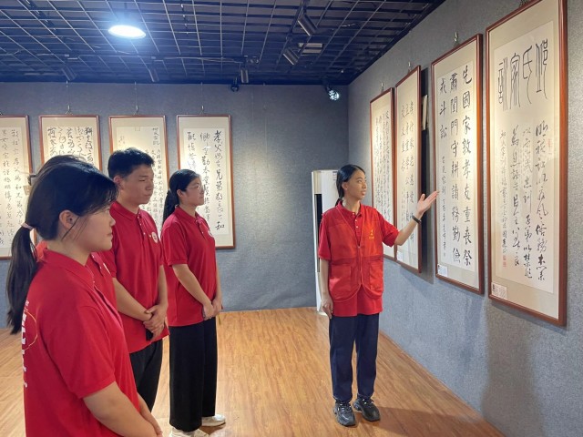 映照初心耀前程,馆内书画如同穿越时空的信使,“红”魂沁入丹“青”。 实践队成员在埭头天云洞家风家训示范基地感悟学习每幅作品的深厚内涵,深刻感受传统家风家训薪火相传、与时俱进的生命力与影响力,在每一片“青”田培植红色记忆“芯”。