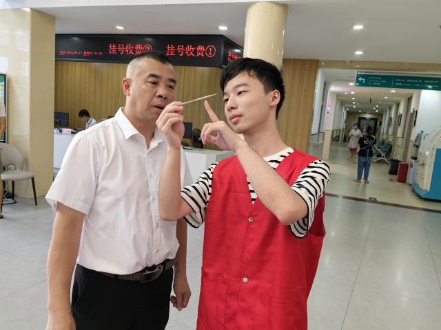 图为实践团成员戴益民在浙江台州的社区医院做基础身体检测和指引服务 。大学生网报通讯员 戴益民 供图