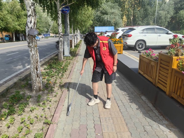 图为实践团成员梁逸成在新疆阿勒泰的金山路社区打扫社区周边花园和路边以及社区内环境卫生志愿服务 。大学生网报通讯员 梁逸成 供图