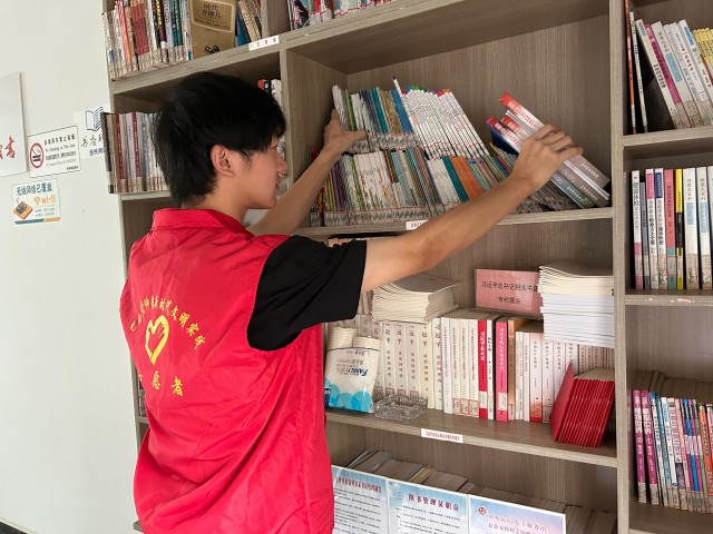 图为实践团成员喻文强江苏淮安社区进行图书的卫生打扫和图书管理及统计志愿服务 。大学生网报通讯员 喻文强 供图