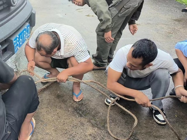 就在这时,我们急忙向村书记打电话求救,书记在得知了我们的困境后,他开着他的电瓶车迅速赶来,他的脸上没有丝毫的抱怨,只有关切和急切。村书记一边安慰着我们,一边四处拨打电话找来帮手,组织村民展开救援。接到村书记电话的村民们冒着大雨纷纷赶来,有的开来了自家的车,有的回家取来了千斤顶等工具,此时,一位特殊的大哥“隆重出场”,拖着粗壮的绳索大步朝我们走来,气场丝毫不失«水浒传》中的林冲。天空的雨依旧下个不停,但却怎么都浇不灭村民拯救我们的热情,几位村民半跪在被雨水打湿的地面,将大哥带来的绳子紧紧攥在手里,一端系在小车上,另一端系在我们的客车上,试图用小车带动客车,把它从沟里拉来。