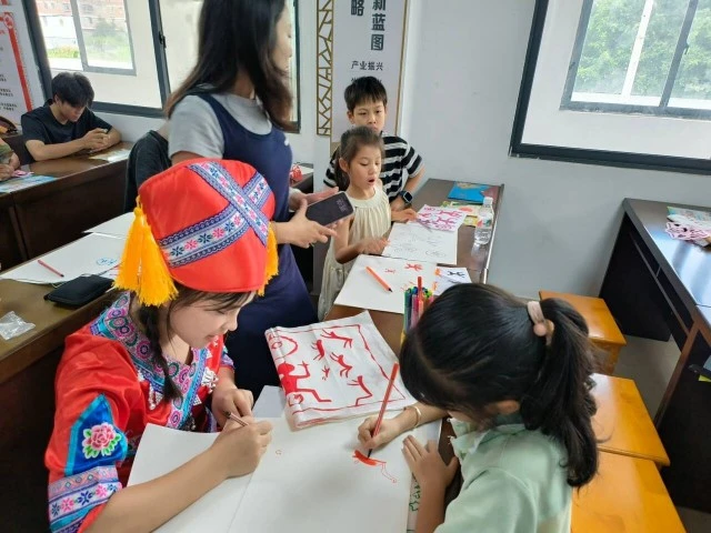 花山岩画,位于宁明县驮龙乡耀达村花山屯北面的明江东岸,以其独特的艺术魅力和深厚的历史底蕴,吸引了无数游客和学者的目光。岩画高44米,宽170米,图像多达1800余个,包括人物、动物和器物三类,生动展现了古代壮族先民的生活场景和祭祀文化。2016年,花山岩画成功入选《世界遗产名录》,成为中华文明的瑰宝。为了更好地传播花山岩画文化,实践团组织了一系列互动体验活动。实践团成员邀请当地村民共同参与了仿画花山岩画图案、制作非遗手工艺品等活动,让大家在亲身体验中感受传统文化的魅力。