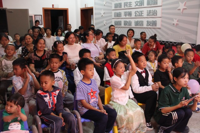 在2024年7月22日晚,临沧市沧源佤族自治县勐董镇文体活动中心里洋溢着欢声笑语,推普小先生课堂展演在这里激情上演,邀请了众多学生家长驻足观赏。通过丰富多彩的艺术形式,展现了当代少年儿童的爱国情怀与多才多艺。