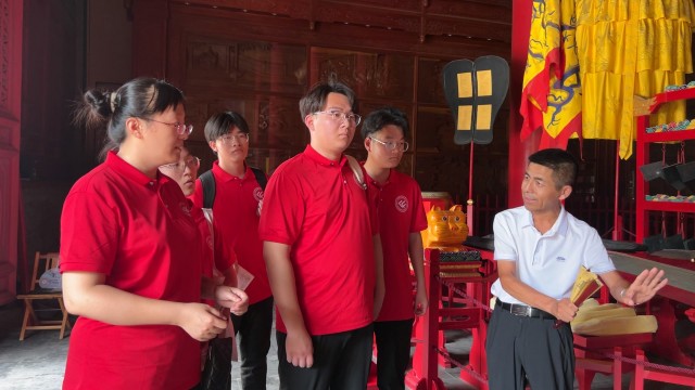图为讲解员为“寻访·探忆·筑梦”中华文化传承团成员介绍孔庙建筑