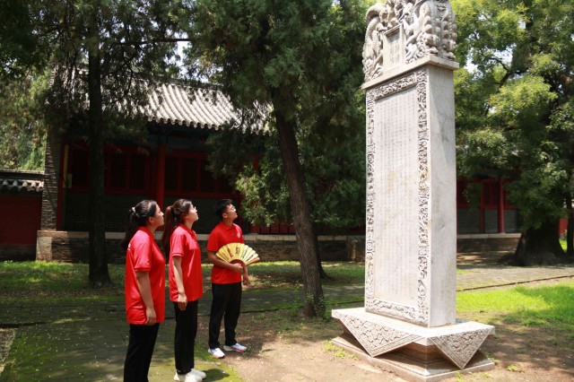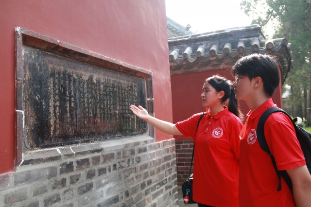 图为“寻访·探忆·筑梦”中华文化传承团成员在学习颜庙石碑