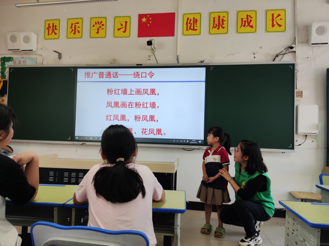 普通话是国家的国语,是各民主之间交流的桥梁,要想各民族之间相互交融,就需要大力的推广普通话,才能促进各民族之间沟通。小朋友们应从小就把民族团结的种子"种"在心里,把学习普通话作为重要基础,学习普通要从小抓起,从小就要培养良好的习惯。团队成员以绕口令的形式,趣味性的练习,吸引小朋友的兴趣,通过多样化的练习形式,有效提升小朋友的普通话水平和语言表达能力。