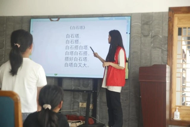 普通话课堂以趣味绕口令落入尾声。经过普通话情感、节奏等技巧的教学之后,实践队成员李梦瑶将所教知识巧妙融入绕口令中,让孩子们在贯口练习中回顾所学知识,在保证清晰流畅的基础上快速、自信地讲普通话、练绕口令。