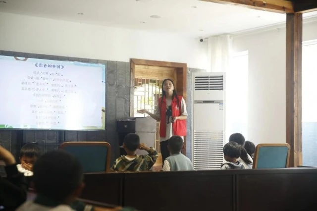 实践队成员李梦瑶设置了一系列普通话技巧教学环节,其中以儿化音练习和模拟主持为主要模块。采用教师讲解、集体朗读再到个人展示的教学流程,使孩子们能在实际情境中自信大方、字正腔圆地表达自我、传递声音。随后,在课堂高潮部分设置了《彩色的中国》和《如果信仰有颜色》两首经典诗词篇目诵读环节。通过语调、节奏、情感的详细教学和解读,以及正确读音的示范和教导,使孩子们用普通话生动地诵读民族经典。