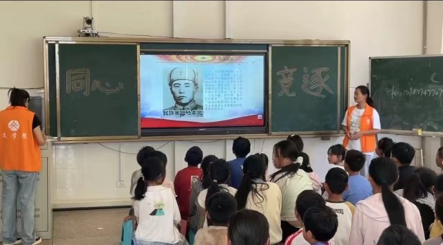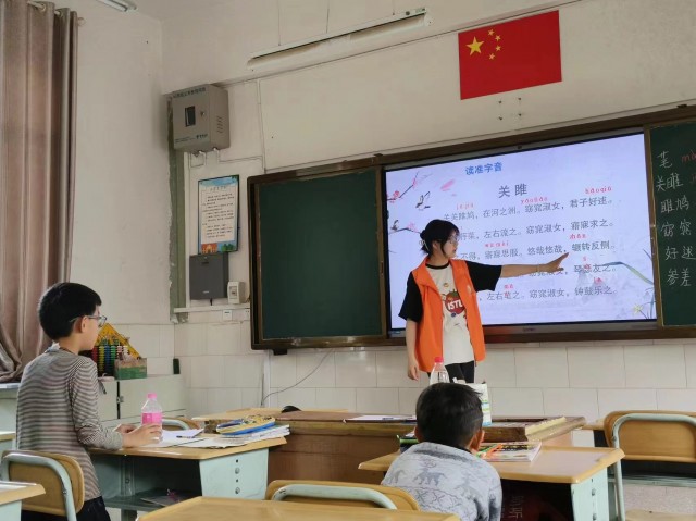 实践团成员结合自身的专业优势,为四、五年级的学生开设了《诗经》讲解课程。“蒹葭苍苍,白露为霜。所谓伊人,在水一方。”孩子们在志愿者的带领下,诵读了一首首脍炙人口的《诗经》篇章,不仅领略了古代诗歌的韵律之美,还深刻理解了其背后的精神内涵和文化价值。这一系列课程不仅培养了孩子们的家国情怀,也加深了他们对家乡文化的认同感和自豪感。