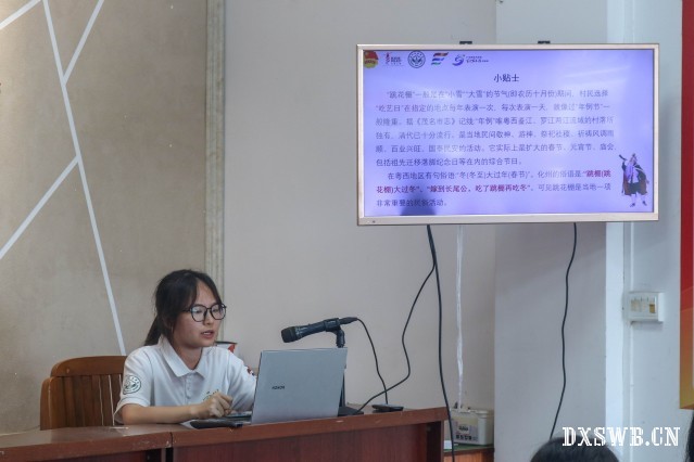 在红袖章平安志愿者协会的宣讲会上,岭南古遗社会实践队的李瑶同学以饱满的热情和专业的知识,为在场的大学生揭开了“跳花棚”这一古老艺术的神秘面纱。她从跳花棚的起源讲起,深入探讨了面具背后的故事和象征意义,用生动的叙述和丰富的视觉材料,引领听众穿越历史的长河,深入非遗文化的艺术宝库。为了增强互动性和参与感,宣讲会特别设置了知识问答环节,激发了青年大学生们的热情参与。这个环节不仅活跃了现场气氛,更让学生们在轻松愉快的氛围中对跳花棚文化有了更深刻的理解和认识,留下了难忘的文化体验。