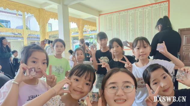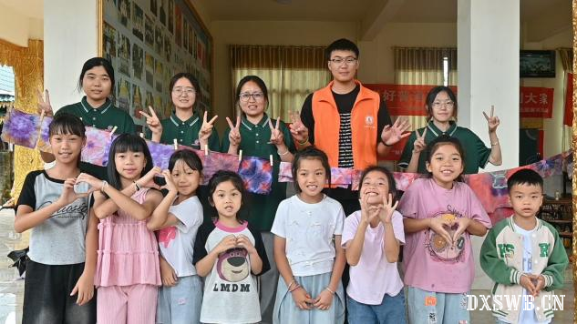 图为推普团成员和小朋友扎染成果展示合影(供图人:曾科祥)