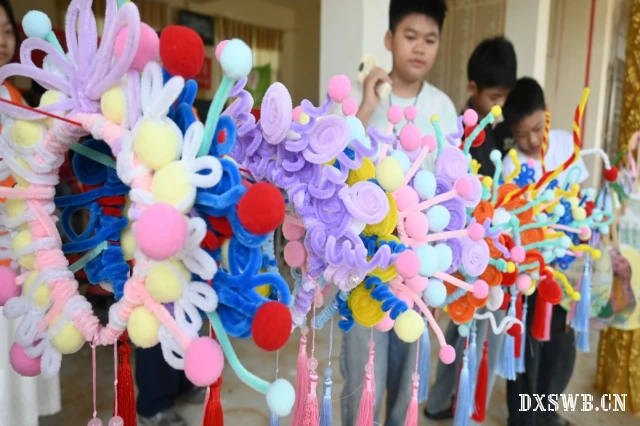 图为推普团成员同当地小朋友一起制作京剧发箍展示 张蓉摄