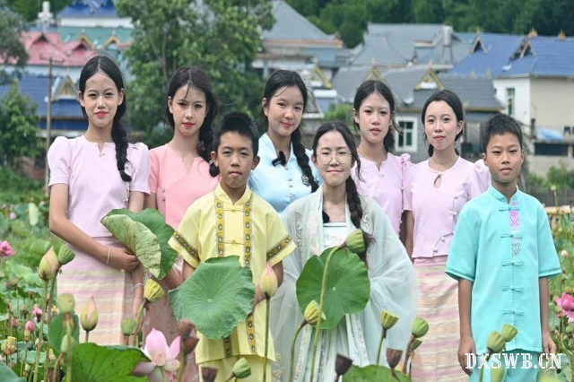 图为推普团成员身着汉服与身着傣装的小朋友共同拍摄荷花宣传片 邵婧芸摄