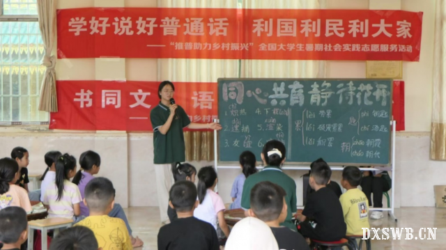 社会实践的时光一晃而过,却在我心里留下了不可磨灭的印记,记忆的画卷描上了一句又一句字正腔圆的诗词朗诵,留下了一张又一张可爱的笑脸,保存了一缕又一缕淳朴的乡风民俗。一句句的学习,一次次的纠音,一遍遍的练习,将近60名小朋友在推普课堂上,不断成长和进步,看着说得越来越流畅的普通话,心中难免感动万分。小朋友眼里亮亮的光是对知识的渴望,洪亮坚定的童音是对中国话的真诚诠释,不论是易错字区分,还是多音字辨析,亦或是儿化音的正确运用,都帮助小朋友们更好的了解普通话,更好的融入社会生活。课堂上,推普成员字正腔圆的为小朋友们讲解正确读音,小朋友们认真听着,默默跟读,在讨论问答环节,小朋友们积极思考,“炽热的‘炽’是不是读‘zhì’呀?”,也有小朋友反驳,“不应该读‘chì’吗?”,推普成员在同学们思考过后给出了正确读音,小朋友们露出恍然大悟的神情,并反复读了几遍,努力记下正确读音,推普成员也露出了欣慰的微笑。在多音字讲解时,小朋友们积极举手为多音字组词,加强理解与记忆,课堂氛围十分活跃,感染着每一个参与课堂的人。