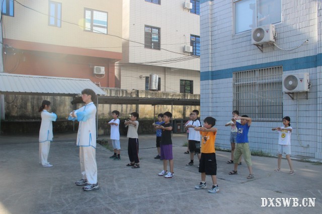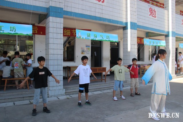 图为孩子们跟着实践队队员学习健身气功(王祎明 供图)