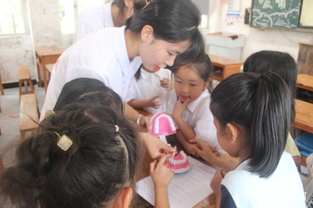 图为实践队队员引导孩子完成牙齿模型(王祎明 供图)