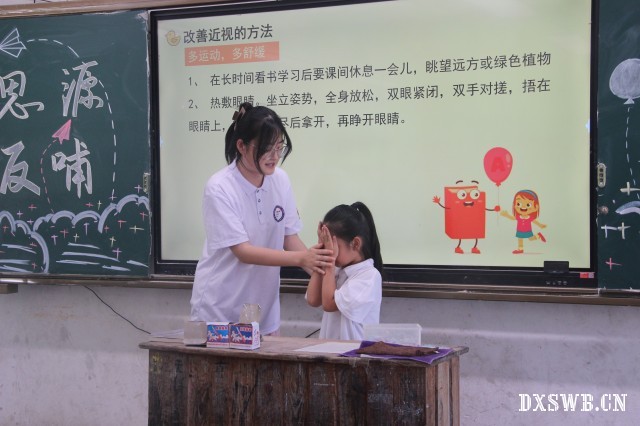 图为小朋友在实践队队员的带领下热敷眼睛。(王祎明 供图)
