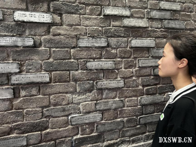 图为实践队员观看纪念馆寄语墙砖。 实践队员何雨涵 供图