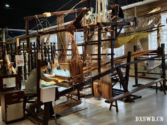 此外,讲解员着重向团队成员介绍了“大花楼木织机”,团队成员也有幸观摩工匠师傅现场织造云锦的过程。大花楼木织机长5.6米,宽1.4米,高4米,灵巧实用,代表着中国古代织造技术的最高成就。现场,团队成员观察到,织机上层的“拽花工”按过线顺序提拽经线,织机下方的“织工”手足并用进行织造,两人配合默契,拽花、盘织、打纬、送经、卷取……在1600年的时间里,无数匠人一次次投梭,把巧思和心血织进丝线中、编进历史里,才能不断传承南京云锦,延续着中国自古以来的文化瑰宝。
