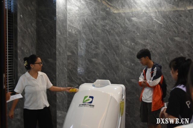 (图为养护中心讲解员为团队介绍养护中心用于“药疗湿蒸”的智能设备)
