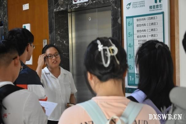 (图为养护中心讲解员向实践团成员介绍养护中心配套的老年病医院的科室设置)