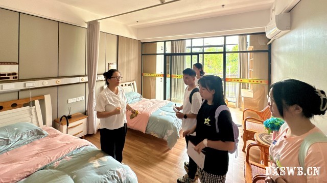 (图为养护中心讲解员向实践团介绍康养病房的基本设施)