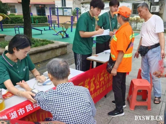 图为宣传员在献血知识的同时为老人量血压。大学生网报通讯员曹续续 供图