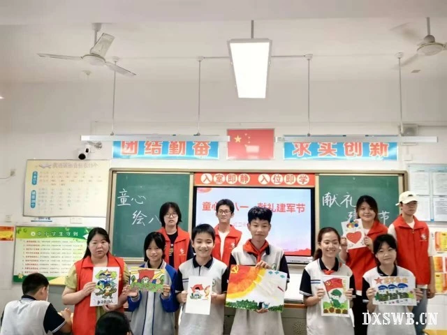 弘扬爱国主义精神,必须把爱国主义教育作为永恒主题。要把爱国主义教育贯穿国民教育和精神文明建设全过程。因此团队队员们借助即将到来的八一建军节开展了一场关于爱国主义的绘画活动,意在通过手中的画笔来传达同学们对祖国对军人的热爱和敬仰,培养新时代青少年心中的红色火种。同学们围坐在画桌旁,神情专注而投入。有的微微皱着眉头,眼睛紧紧盯着画纸,手中的画笔时而迟疑,时而果断地落下,似乎在脑海中精心构思每一笔的走向。有的同学则嘴角上扬,带着轻松愉悦的笑容,画笔在手中轻快地舞动,仿佛正在描绘着一个无比欢乐的世界。还有的同学眼神中充满好奇与探索,不时歪着头,观察着周围小伙伴的作品,然后又迅速转过头,继续沉浸在自己的创作之中。他们的小脸因为认真而显得格外可爱,那专注的神态仿佛在诉说着对祖国的热爱。即使在刚开始,同学们稍感羞涩,但爱国情怀从不会褪色,他们拿起画笔,画出心中祖国的模样,是绚丽的五星红旗,是庄严的天安门广场,是可爱的人民军队......他们用最简单的方式表达着“清澈的爱,只为祖国”。