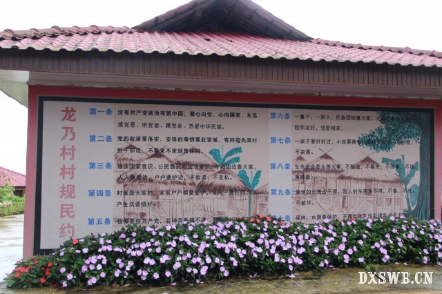 进入龙乃村,村里的书记为我们细致讲解了龙乃村的历史。一寨划分两国。中华人民共和国成立前,龙乃村属于缅政府管辖,直到1960年10月才回到祖国的怀抱。走进龙乃村,红色的石棉瓦屋顶,白色的墙壁,干净的混凝土路面,房前屋后都种有植物,牛头、牛角形的路灯杆上挂着中国红的葫芦,处处可见五星红旗迎风飘扬,还有淳朴而细致的村民村规。