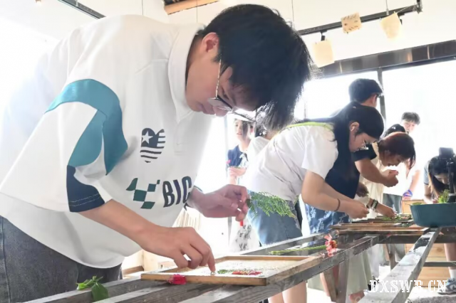 制作花草纸的过程既简单又充满乐趣。队员们首先挑选了自己喜爱的鲜花和绿叶,这些色彩斑斓的花瓣和柔嫩的叶子将在接下来的制作中成为纸张上的独特图案。在师傅的耐心指导下,他们学会了如何将纸浆均匀地铺展在细网上,再小心翼翼地将挑选好的花草放置在纸浆之上。每一片花瓣、每一片叶子的位置都经过了深思熟虑,仿佛在创作一幅精美的画卷。