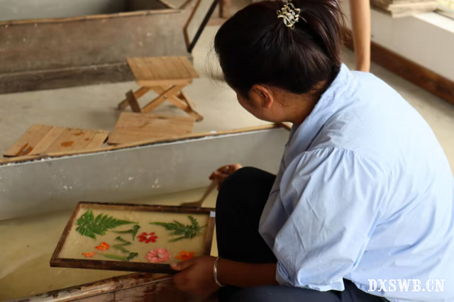 随着纸浆的逐渐凝固,花草的纹理与色彩在纸面上缓缓展现,每一张花草纸都成为了独一无二的艺术品。队员们围坐在一起,相互交流、相互协作,欢声笑语不断。他们不仅学到了精湛的技艺,更在实践中培养了团队精神和对传统文化的敬畏之心。