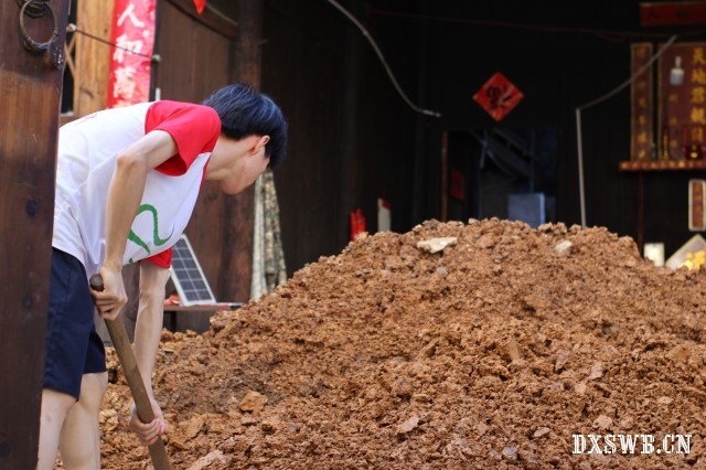 (图为志愿者在老人家中铲土,修建粪水池)