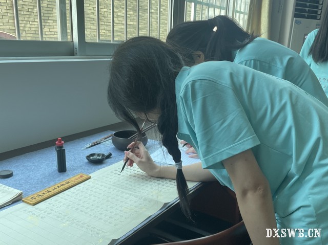 图为实践队成员在活动室体验书法活动。鄢雨柔 供图
