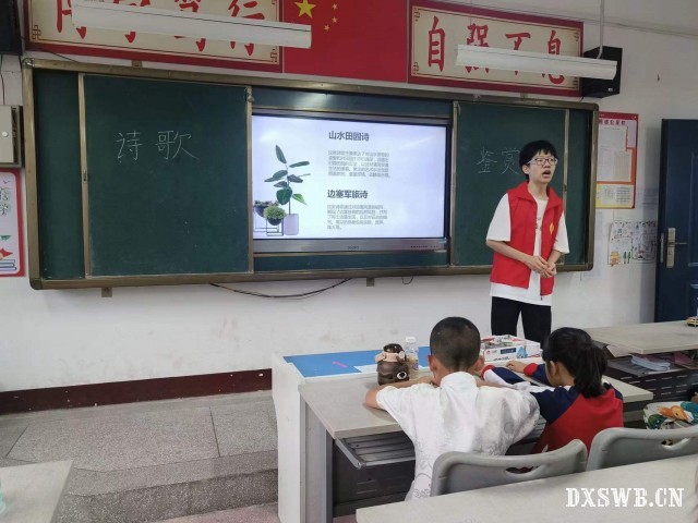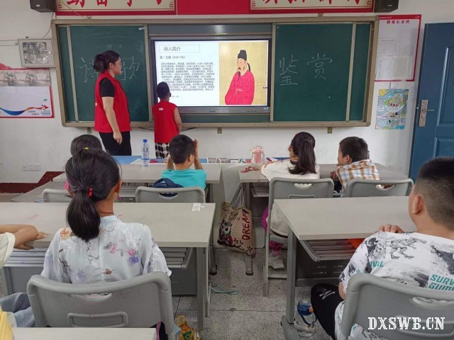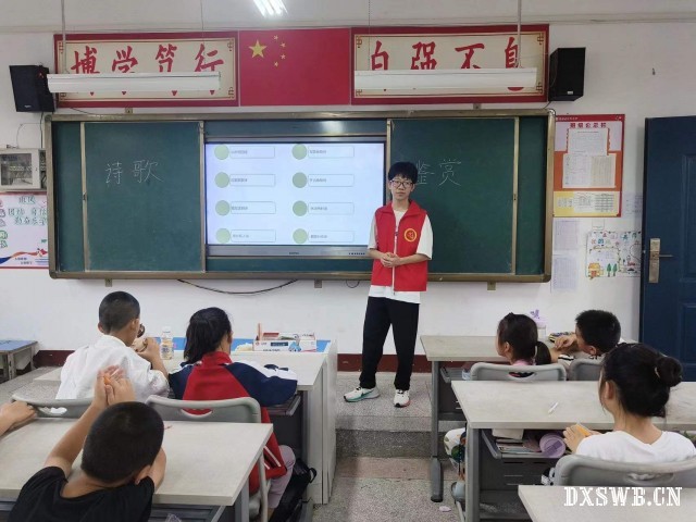 为了让学生们体会诗歌的魅力。湖北汽车工业学院科技学院青锋·星源志愿服务队的志愿者们于2024年7月12日在湖北省黄冈市红安县上新集镇董必武红军小学开展了关于诗歌的课程。让同学们一起沉浸在诗歌的世界里,让诗韵悠扬在同学们的心间回响,让心灵画卷在同学们的生活中缓缓展开,感受那份独属于诗歌的美好与深刻。