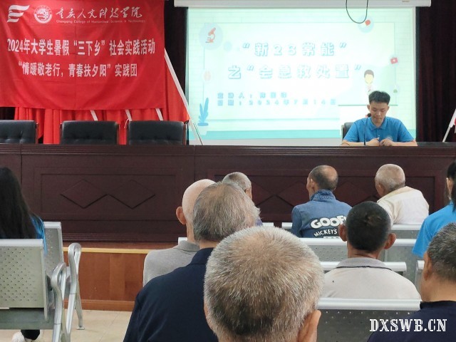 2024年7月14日,重庆人文科技学院“情暖敬老行,青春扶夕阳”三下乡实践团前往十直镇养老院举办“新23常能”之会急救处置与防诈骗知识宣讲活动。旨在提升老年人的自救互救能力和防骗意识,确保他们在突发状况下能够得到及时有效的救助,营造一个更加安全和谐的生活环境。