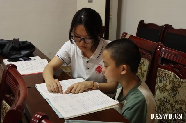 图为实践队队员正在给小朋友们进行一对一作业辅导