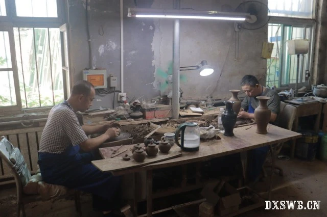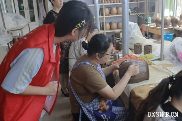 为积极响应传承和弘扬中华优秀传统文化的号召,深入探索传统手工艺的魅力与价值。2024年8月12日,青岛农业大学艺术学院“陶渊古韵”赴山东德州实践服务团前往德州开启了一场意义非凡的文化之旅。此次活动旨在深入了解黑陶文化的历史底蕴和文化魅力,为传承和弘扬非物质文化遗产黑陶文化贡献青春力量。“陶渊古韵”实践服务团踏寻黑陶足迹,来到德州市齐河县张辉黑陶厂。在传承人的接待下,实践团开启了一场意义非凡的非遗黑陶之旅。传承人首先为实践团队员们介绍了黑陶的历史渊源,她讲到,黑陶诞生于中国新石器时代,以其“黑如漆、亮如镜、薄如纸、硬如瓷”的独特品质,被誉为“土与火的艺术,力与美的结晶”。德州作为黑陶的重要产地之一,有着悠久的黑陶制作历史和深厚的文化底蕴。张辉一边带领实践团成员参观制陶车间一边详细地介绍着黑陶的制作过程。从选土、制泥、拉胚、雕刻到烧制,每一个环节都需要精湛的技艺和丰富的经验。
