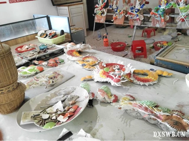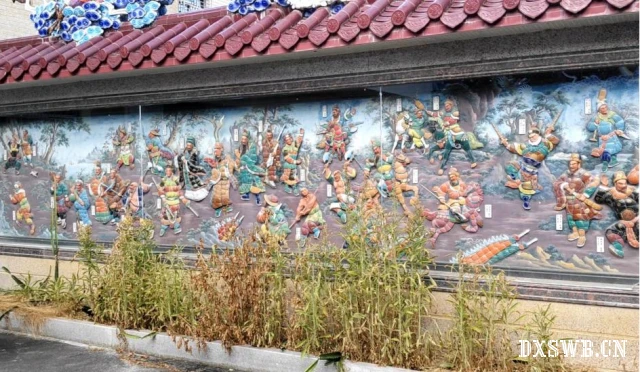 嵌瓷作为国家级非物质文化遗产历史悠久,而大寮嵌瓷工艺社作为当地一个嵌瓷艺术的展示地,更是呈现了一张极具当地特色的文化名片。整个工艺社外围建筑采用了嵌瓷工艺进行装饰,成员们进入工艺社,映入眼帘的便是一整面嵌瓷而成的梁山好汉。