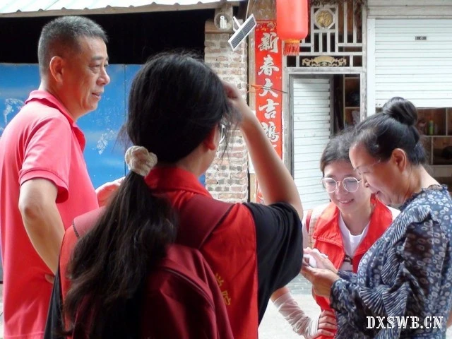 图为实践团成员走村入户向当地居民宣传面对电信网络诈骗的防范措施。奉文迪 供图