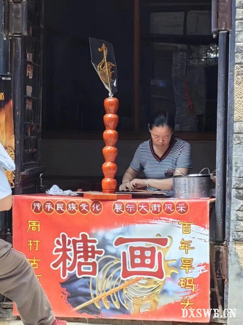 走进大清邮局,在现代的时空中接收来自漫漫历史长河的书信,邂逅历史中的劳动人民的遥遥迟书信。“乐道拾遗,淄运千年”实践团成员透过古朴典雅的建筑风格以及邮局内部陈列着各个时期的珍贵邮票和邮政用品,特别是清代发行的“大龙邮票”等陈列物品,了解到中国早期邮政事业的发展历程和邮政文化的独特魅力,感受到了历史的厚重感,也让他们对邮政文化有了更深入的了解和认识。三、品尝甜蜜,绘制糖画故事步入糖画小店,对话糖画手艺人。“乐道拾遗,淄运千年”实践团成员全程观看糖画制作手艺人制作糖画的过程,在手艺人一抬一落的动作间一个栩栩如生的生肖鸡就诞生了。在这个过程中实践团成员了解到,作为一种源自民间的传统手工艺,糖画以其独特的制作方式和精美的图案设计而闻名。仅凭一勺热糖、一块凉板,就能在一段时间内绘制出惟妙惟肖的图案,展现出匠人的高超技艺和对生活的美好愿望。不单是一种味蕾上的享受,更是连接历史与当今社会的文化缎带。