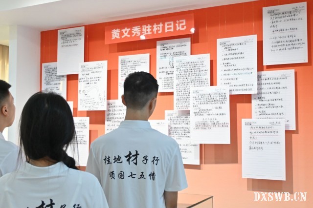 图为实践团成员在百坭村黄文秀先进事迹展览馆参观阅读黄文秀同志驻村日记手写稿。李莹莹 供图